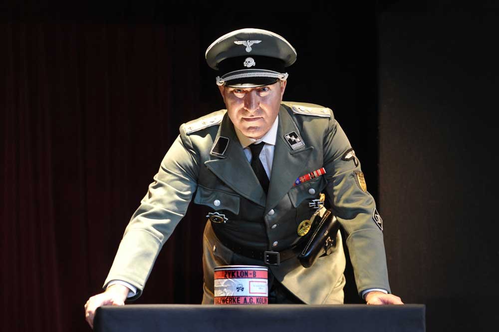 He was there before the audience arrived and remained, still, staring, as they took their seats. The lights went down and in marched an SS officer with a swagger stick uniformed in Field Grey, the mark of the Wehrmacht, the soldiery of which he, Rudolf Höss, the real-life commandant of the Auschwitz concentration camp, claims to be a part. We, the audience are his soldiers, those working within the camp, to whom Höss addresses an hour-long lecture.