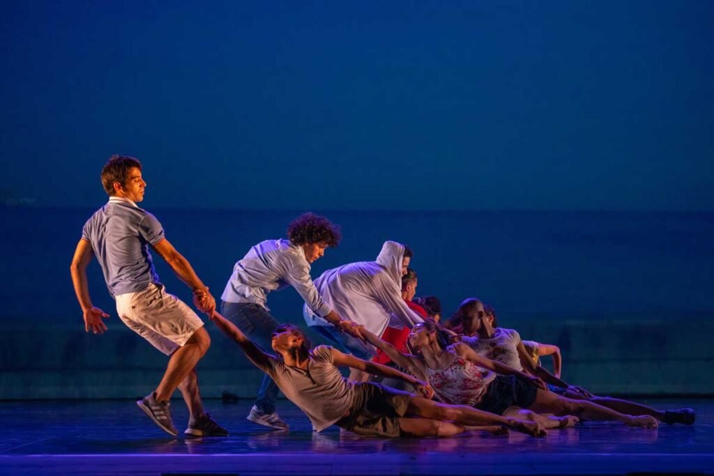 After the interval, a powerful and strong piece “Llamada” (choreographed by Goyo Montero). While Cuba as a country might be a little slow to catch up with human rights (further info) the joy in creating theatre and the creative arts is that you can educate and express yourself more freely. This piece has strong dynamic block formations, a powerful musical score, and breakout groups of boy with girl, boy with boy and girl with girl. The dancing becomes more intimate and the dancers strip down to nude underwear and we have some sensual choreography, all perfectly perfomed in strong balance lifts and floor work.