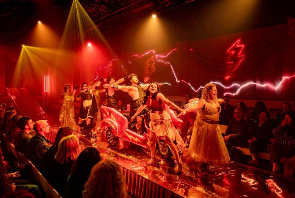 The Design works so well here. With chariot races between Zeus and Hades and fog machines in the red gates of hell, this is an adventure playground for adults. One of the highlights has got to be when the very large bar menu lowers down at one end like a drawbridge and connects as a ramp onto a portable ramp for Zeus in his motorised chariot. This takes the production values higher than many West End shows and could rival the original production of Starlight Express.