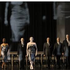 The cast introduce themselves amusingly at the Act 1 curtain. All multinational members are now in their seventies, and one is eighty years old.  The women remain elegant, their elderly well-dressed  roués still handsome. As they perform their mating rituals, slowly often, in repetitive patterns, sexual humiliation and aggression emerges, and particularly in the projected footage, is shocking.  At the culmination, whilst the projection shows all the young male members of the original abusing a single woman, her old self stands alone on stage. Does she long for the aggressive sexual attention of years earlier, is she grateful now to be alone, or is she now just old and lonely?