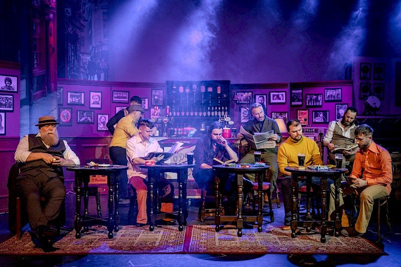 The show which consists of 6 exceptionally versatile vocalists and instrumentalists is set in a well-dressed pub in the back streets of Dublin.  in fact the design of this otherwise quite basic show was both elegant, interesting and colourful with its videography, projections of old Dublin effective lighting (lit by Alistair Penman). And so the cast sit around  nonchalantly drinking and telling us the story of The Dubliners which start starts in the early 1960s, During the following decades the band grew, attracted a global audience, lost some of its members and gained new ones and in the late 60s contemporized their catalogue with the assistance of Phil Coulter the hit songwriter who wrote top ten hits for among others Cliff Richard and Sandy Shaw, as well as a having a hit song themselves- the title number of the show, a wonderful rhythmic novelty song about a gullible Irishman who accepts his wife’s explanation for suspicious activity around the matrimonial bedroom.