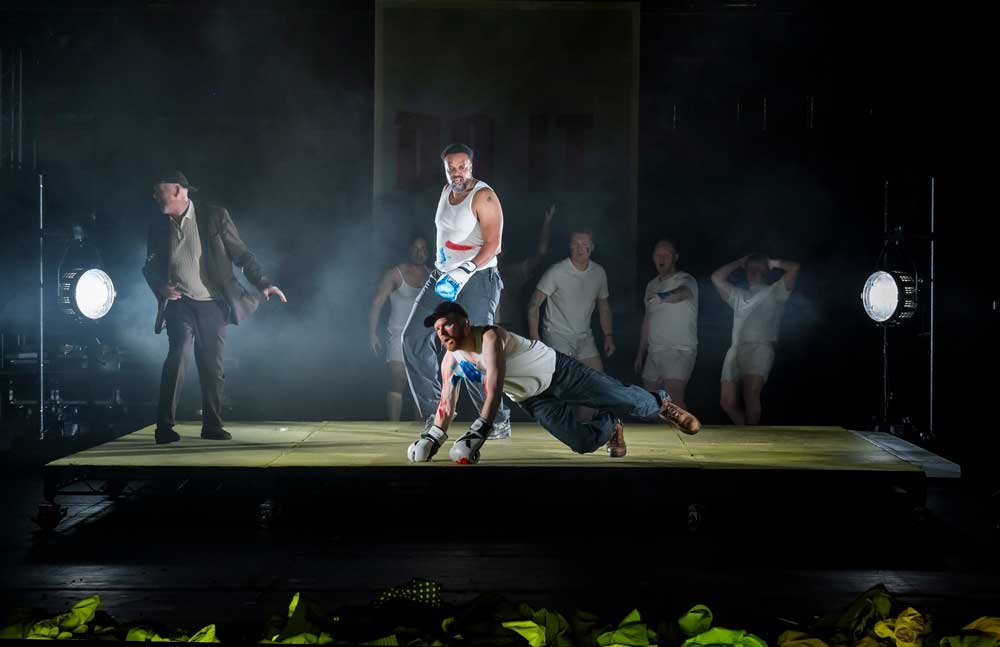 The production itself, under the sure hand of Jamie Manton, is large, expansive, comical, clever and beautifully staged. The large ensemble is moved around the large Coliseum stage confidently, sometimes as a Greek chorus sometimes as an angry crowd in off centre, sometimes agit prop and bizarre, edgy, often bare settings (by Milla Clarke), in lighting designer, D. M. Wood’s half-light and shadows reflecting German expressionist cinema. And it is so witty! As a typhoon is set to strike Mahagonny a red costumed, tap-dancing weather vane threatens the citizenry to choreographer, Lizzi Gee’s dance moves.