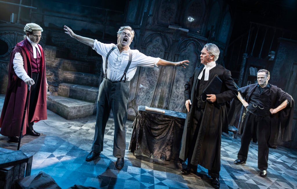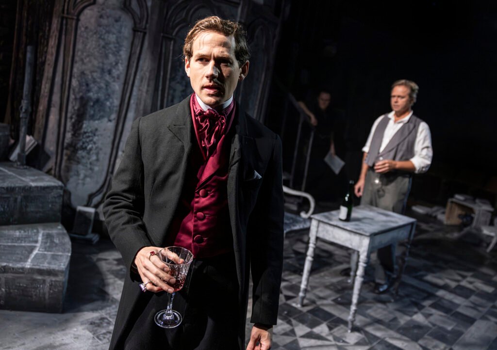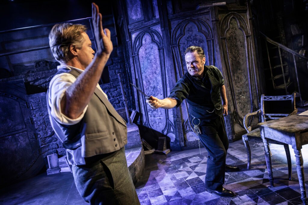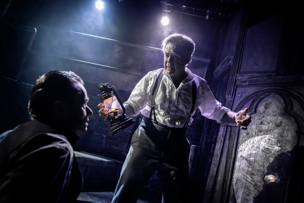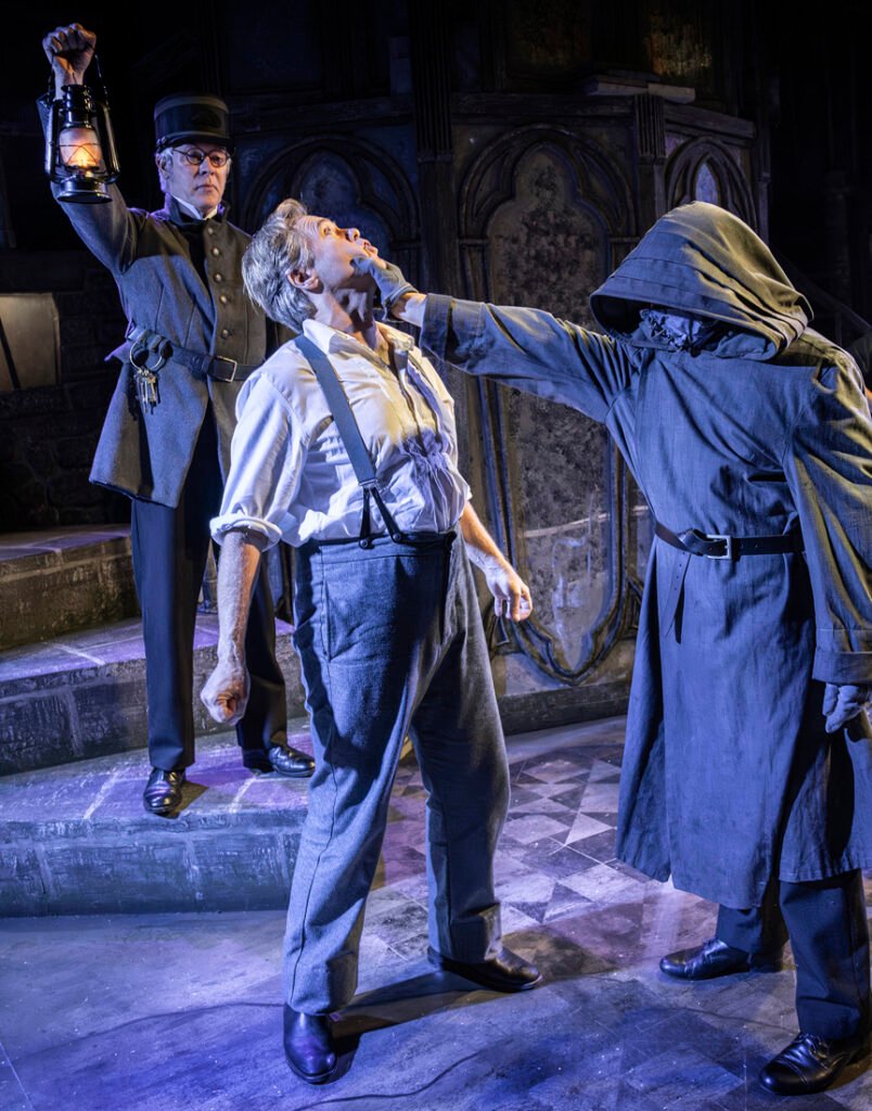 The quality of the productions put on by the Mill at Sonning are just superb and this time is no exception. It’s an amphitheatre curved style auditorium and the production values are stunning. The Set has a curved bay window of glass mirror panes flanked by a staircase on one side and a spiral staircase on the other. A large Vault door with spoked wheel lock os also to one side and then there are catwalks linking several aerial entrances. It’s mottled down to be the interior of a dusty grand castle.