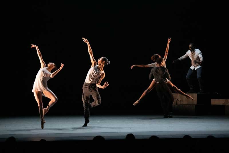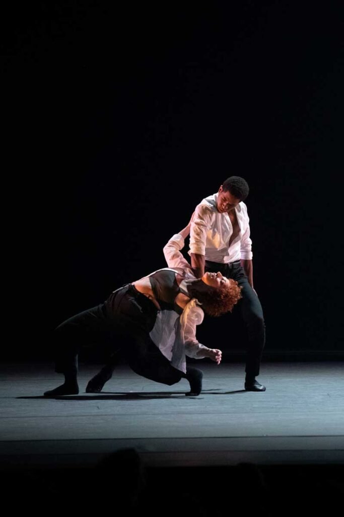 ‘The Barre Project, Blake Works II’ is the opener with Peck and three male dancers. It is a suite of dances, performed against ‘blacks’ and bare ballet barre, and choreographed by William Forsythe. It started as a pandemic-era digital dance film hailed as a “half-hour of perfection”. Now it is an exhibition of effortless blending traditional ballet technique with modern, percussive music by James Blake, and led by Peck, in a high energy and joyful improvisation on the ballet barre. Peck herself has the style, the elegance and the mobility of a Margot Fonteyn at her peak.